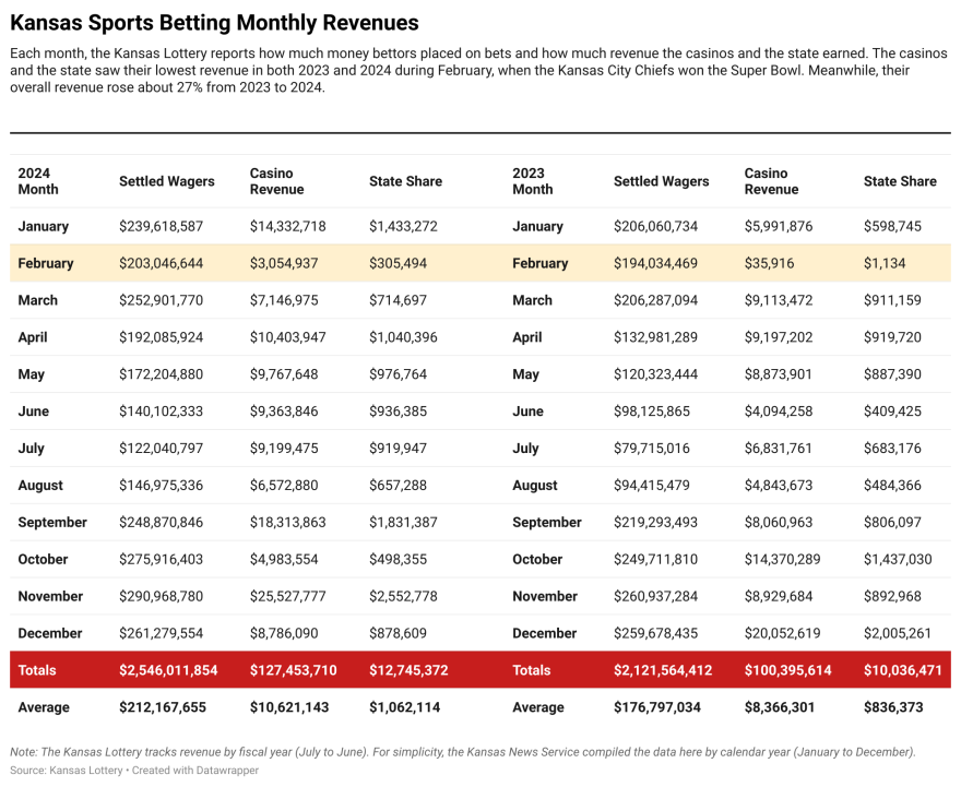 A year later, the Chiefs won the Super Bowl again, and the state collected just $305,000 — again the lowest amount of revenue for the year. Kansas may again see February produce the lowest amount of sports revenue for the year if the Chiefs complete their historic three-peat on Sunday.