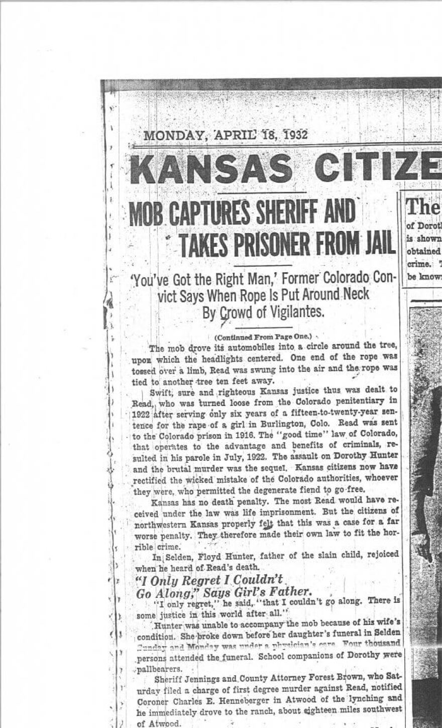 Under Kansas law, automatic suspension of the sheriff of Cheyenne County was announced by Governor Woodring, and an investigation of the incident was conducted by the State Attorney General and his staff. No charges were brought against anyone, and the sheriff was quickly reinstated. The Governor announced that after the investigation and hearing, he was fully convinced that the law officers involved used every available means to protect the prisoner, and were not at fault for Read’s removal from the Cheyenne County Jail. A story from The Denver Post summed up the majority opinion on the event by declaring that ‘the execution of Read is called a lynching…but it is nothing but justice…the citizens who strung up this fiendish murderer are a credit to their community’. No one ever learned the identity of any of the members of the vigilante group that took justice into their own hands on April 17, 1932.