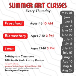 Switchgrass art cooperative provides affordable retail space to living artists at low commissions. Switchgrass currently has 22 artist members and over 1,600 pieces of artwork at 208 South Main in Lucas. Art can also be purchased at www.switchgrasscoop.com and shipped directly to the customer. Lucas is the Grassroots Art Capital of Kansas and sees thousands of tourists every year.