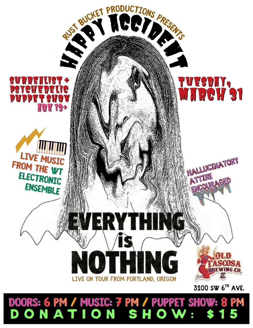 For one night only, Rust Bucket Productions presents "Everything Is Nothing: A Psychedelic Puppet Show from Happy Accident." Traveling all the way from Portland, Oregon, the fine folks at Rust Bucket Productions and Mucky Duck Theatre bring you a bizarre night of surreal puppetry, performance art, and off-kilter story telling.