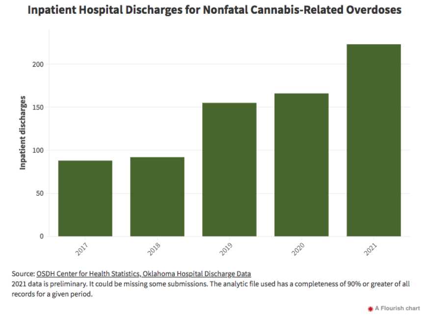Accidental consumption and overdoses rose dramatically in Oklahoma after the state legalized the drug for medicinal use in 2018. According to data from the Oklahoma State Department of Health, there was a 253% increase in discharges from Oklahoma hospitals for marijuana overdose between 2017 and 2021.